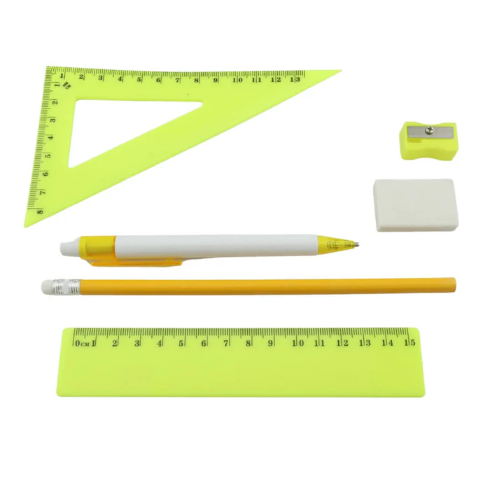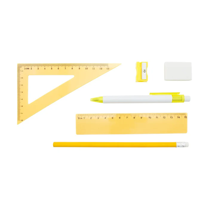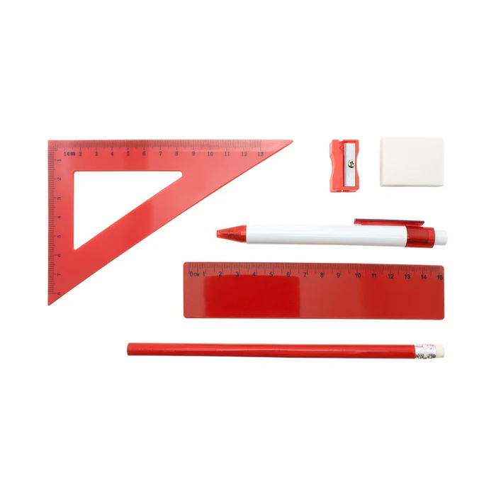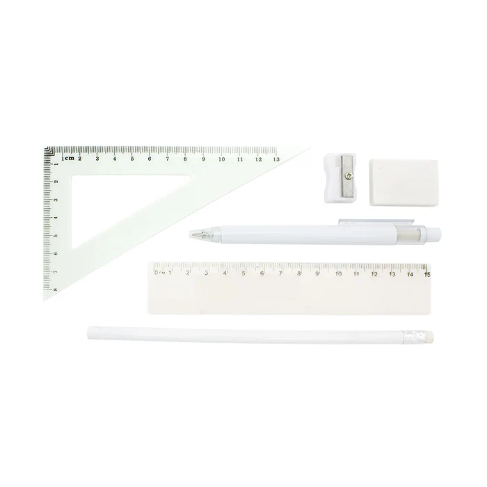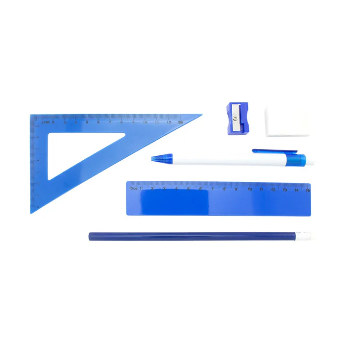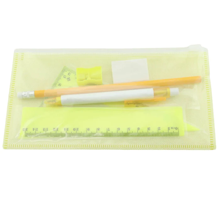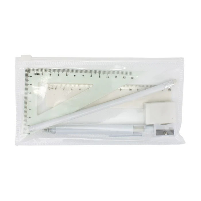 Incluye: esfero, lápiz, regla, escuadra, borrador y tajalápiz. Cartuchera con cremallera ziploc. Disponible en color: