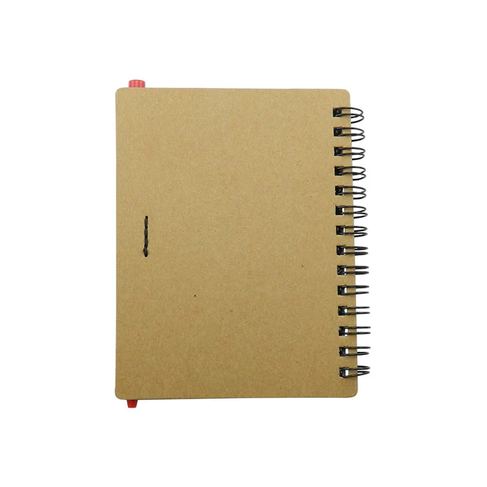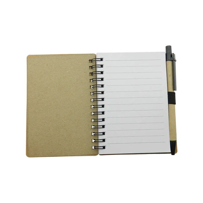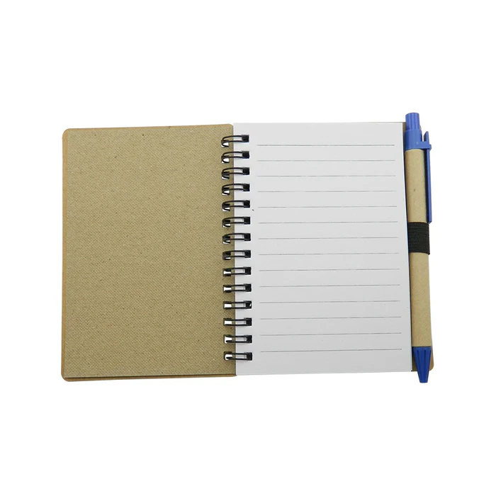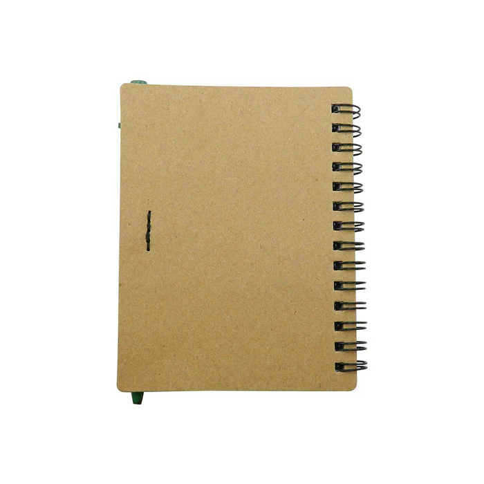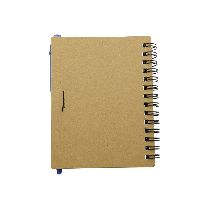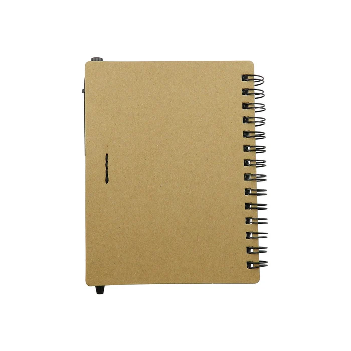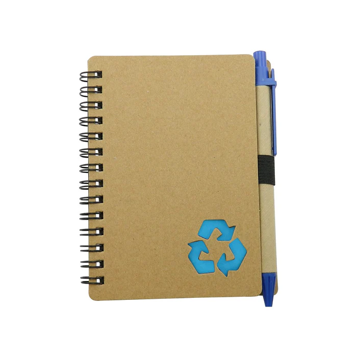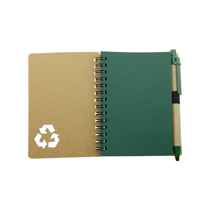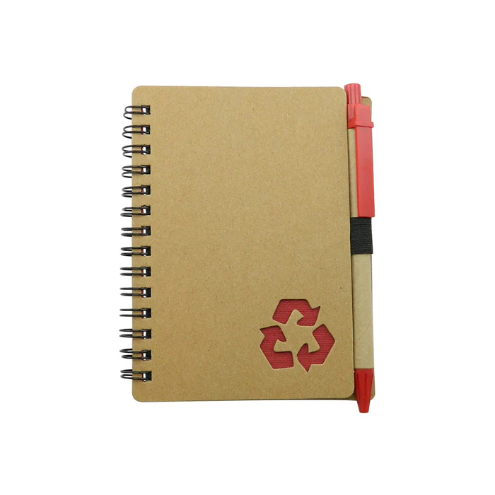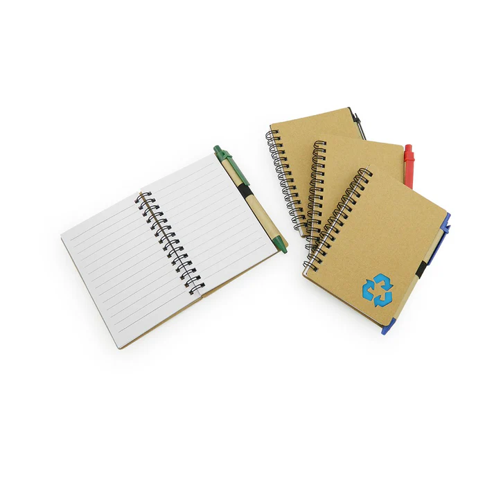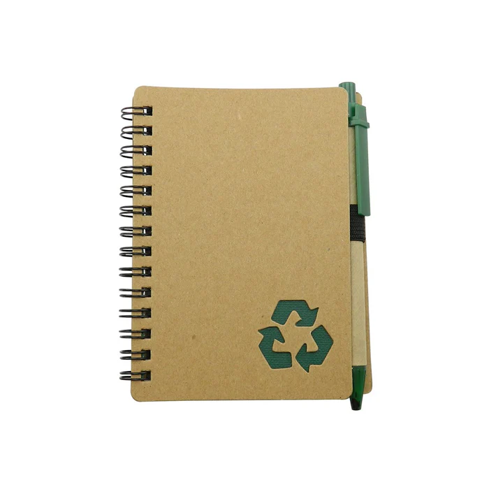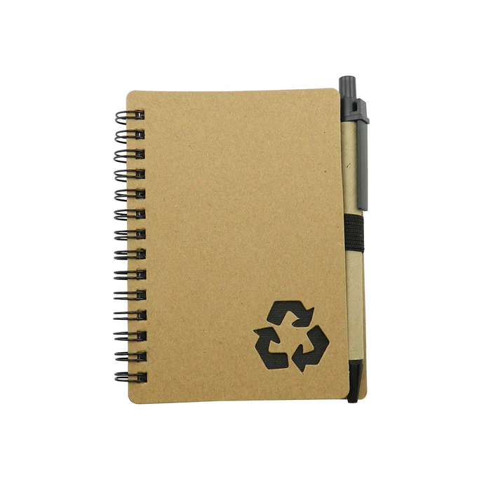 Cuaderno con cubierta en cartón con logo reciclaje troquelado, con 70 hojas rayadas, incluye esfero.