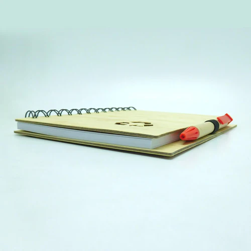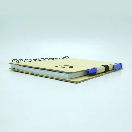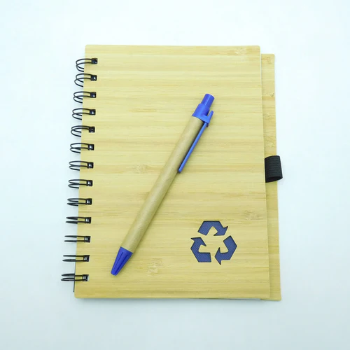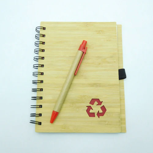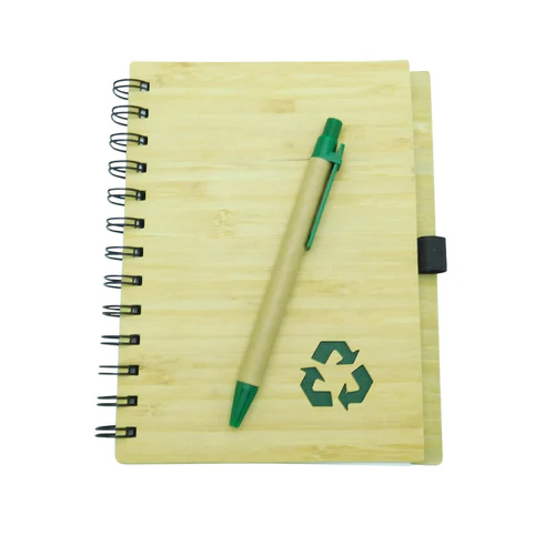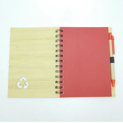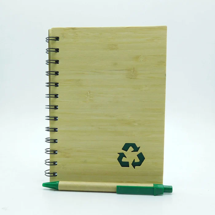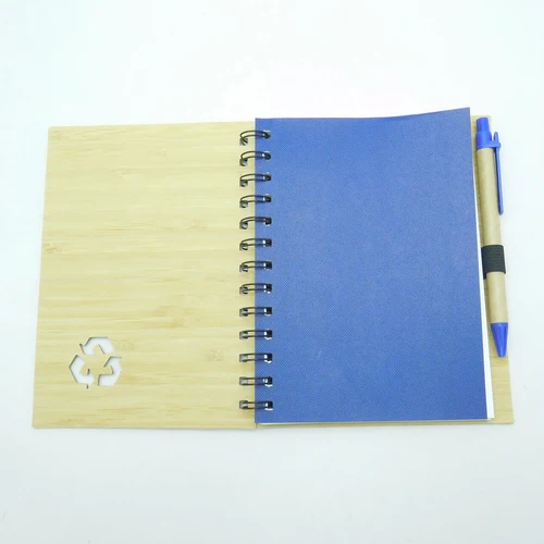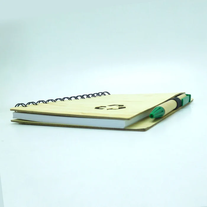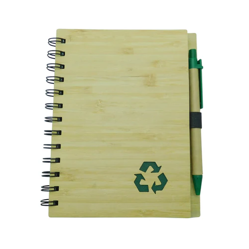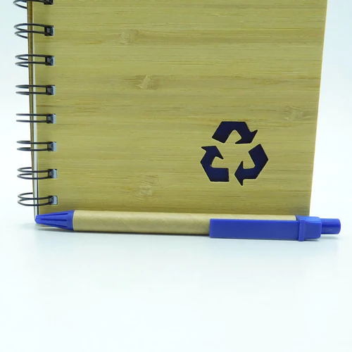 Agenda con caratula en Bambú con troquel de logo de reciclaje.
