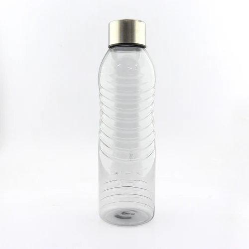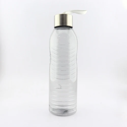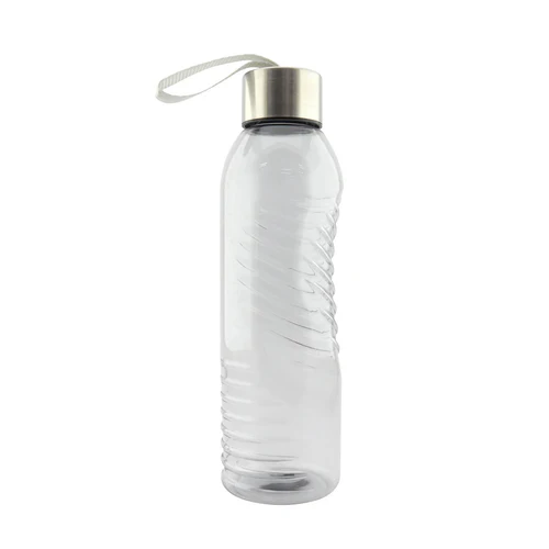 Botilito elaborado en plástico transparente, tapa metálica y cordón para cargar.