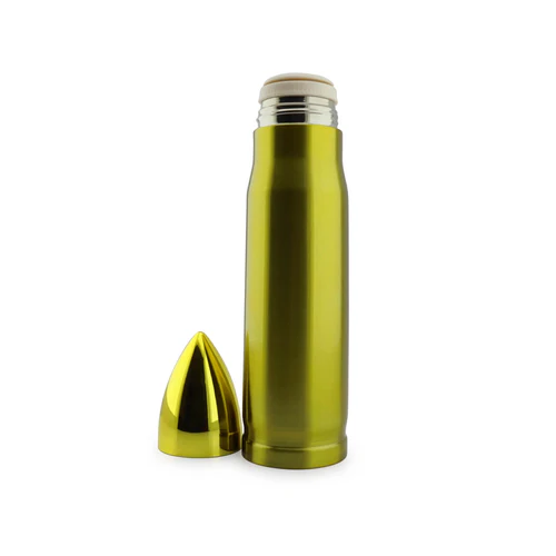 Botilito metálico en forma de bala dorado, en acero inoxidable de doble pared, tapa en plástico dorada.