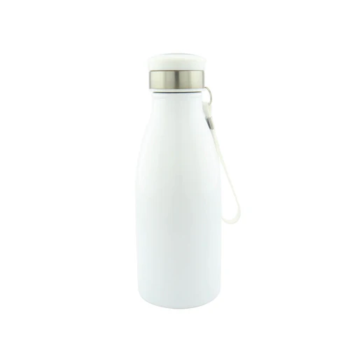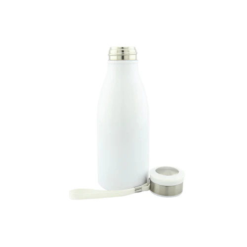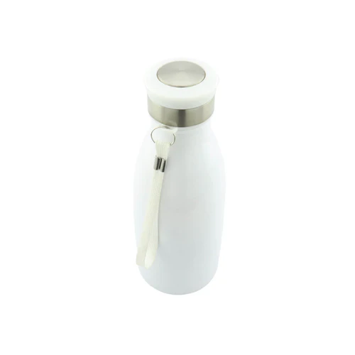 Botilito metálico, en acero inoxidable tipo caramañola con cordón fácil para llevar, tapa metalica.
