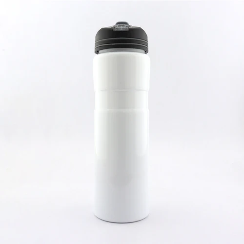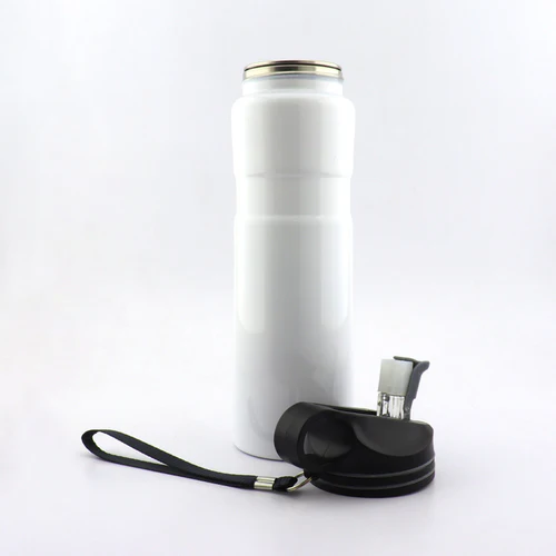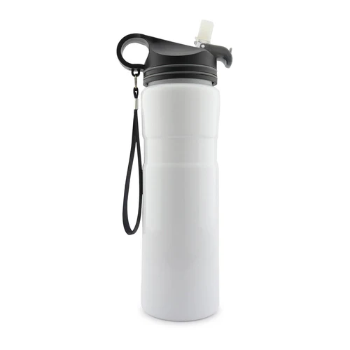 Botilito metálico en acero inoxidable, con tapa plástica, forma circular para sujetar, incluye cordón y pitillo.