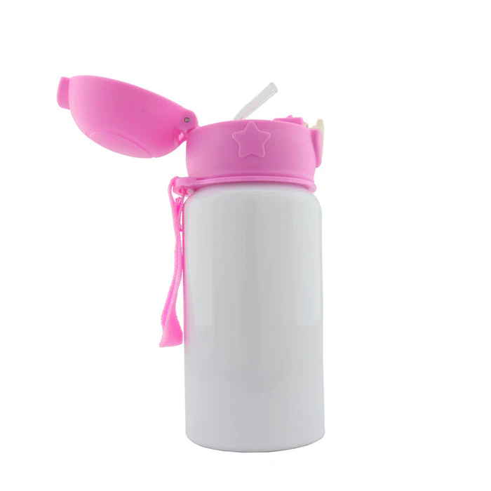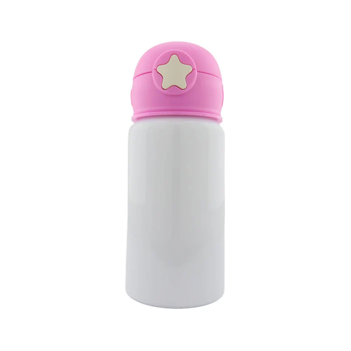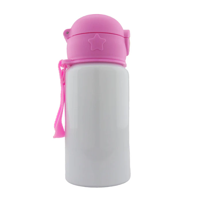 Botella para sublimación con cuerpo blanco y tapa de colores con diseño infantil de estrella, ideal para personalizar con ilustraciones, nombres o personajes. Su estilo llamativo y práctico la hace perfecta para regalos y uso diario. Disponible en color: