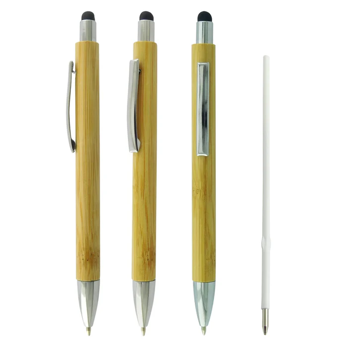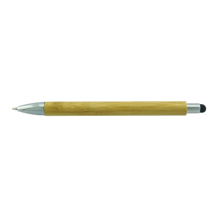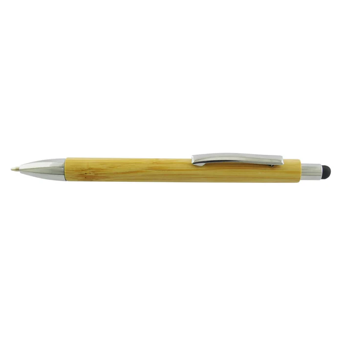 Esfero con cuerpo en madera de bambú, clip y puntas cromados, retráctil.