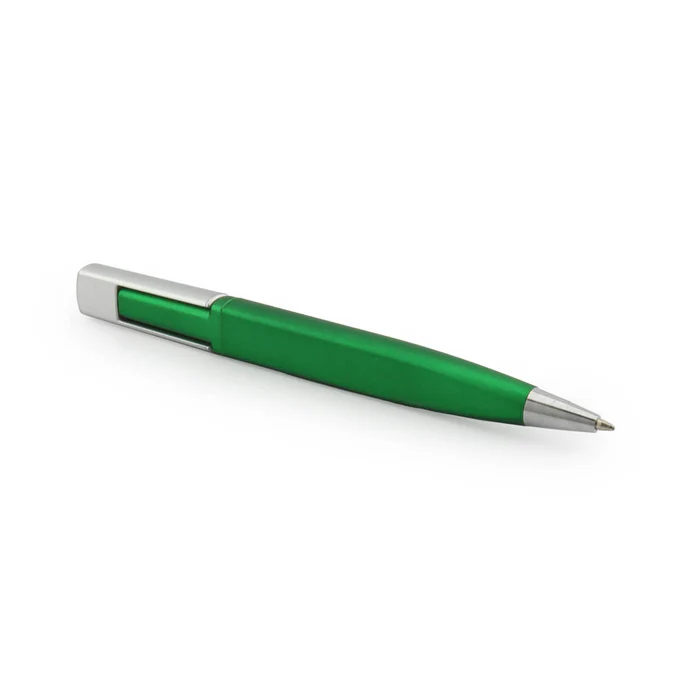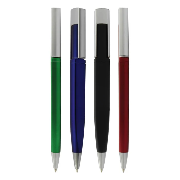Esfero plástico con color metalizado brillante, cuerpo de color, sistema giratorio, parte superior y punta color plata. Disponible en color:
