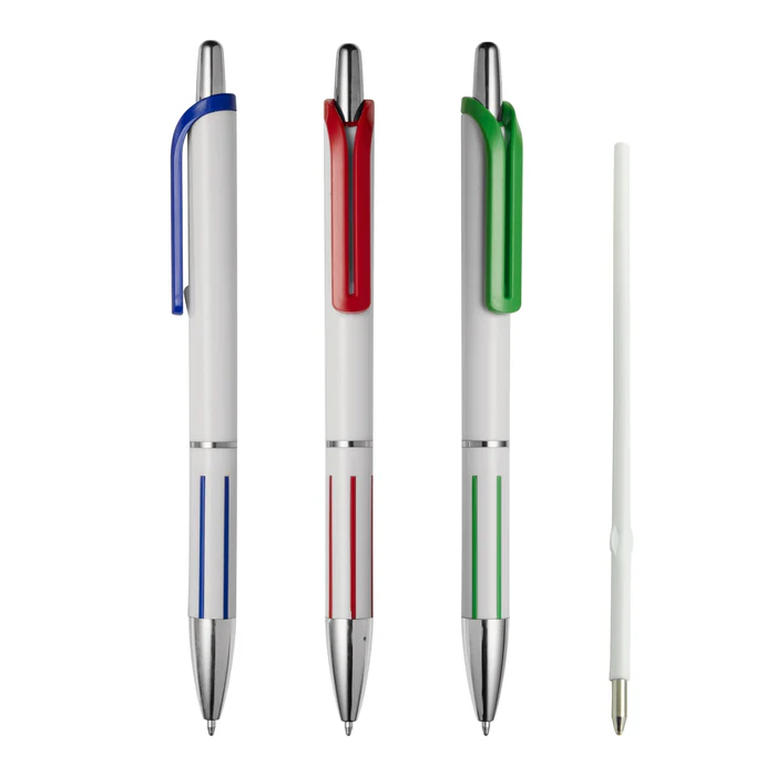 Esfero plástico brillante, clip, punta y acabados cromados. Disponible en color: