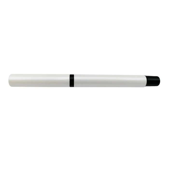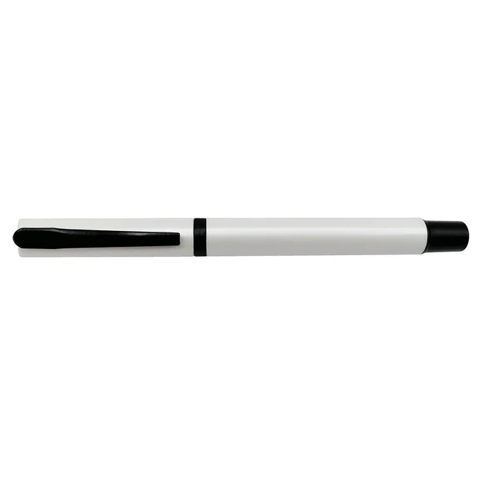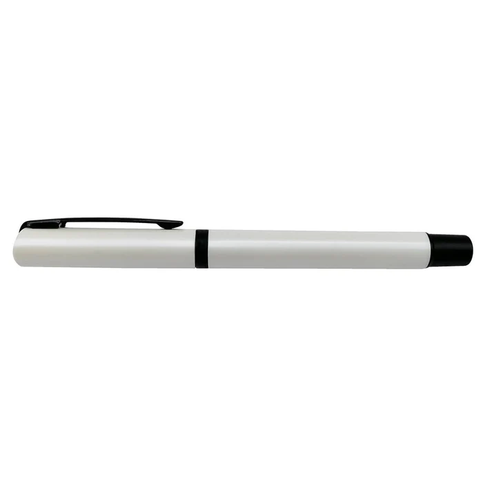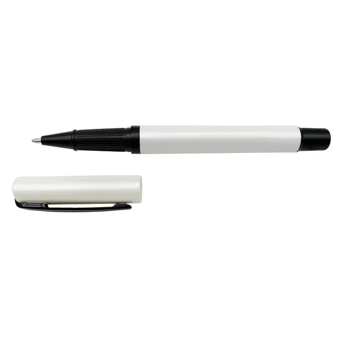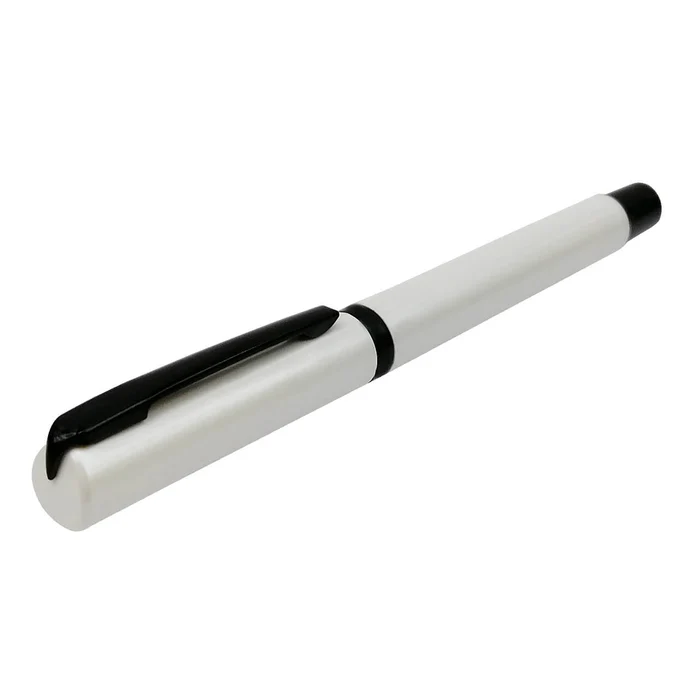 Esfero plástico blanco perlado, tapa con clip y punta negra.