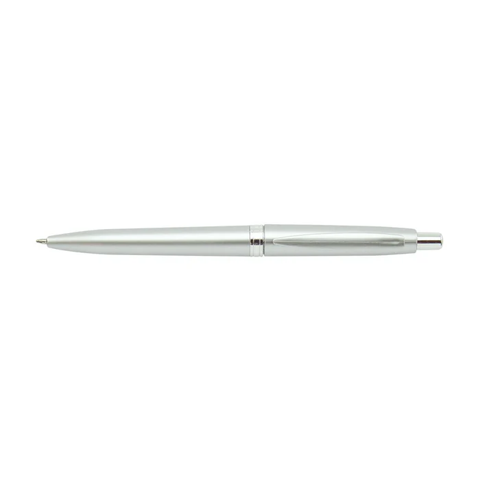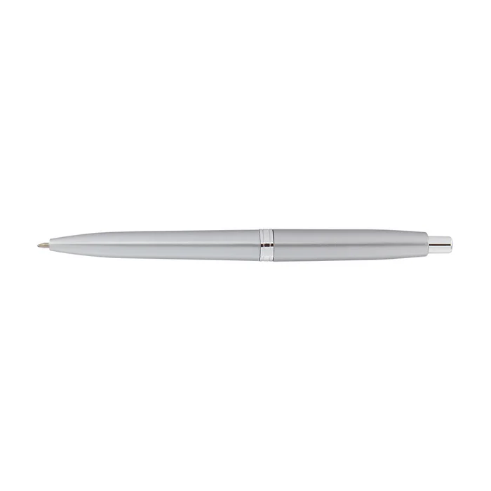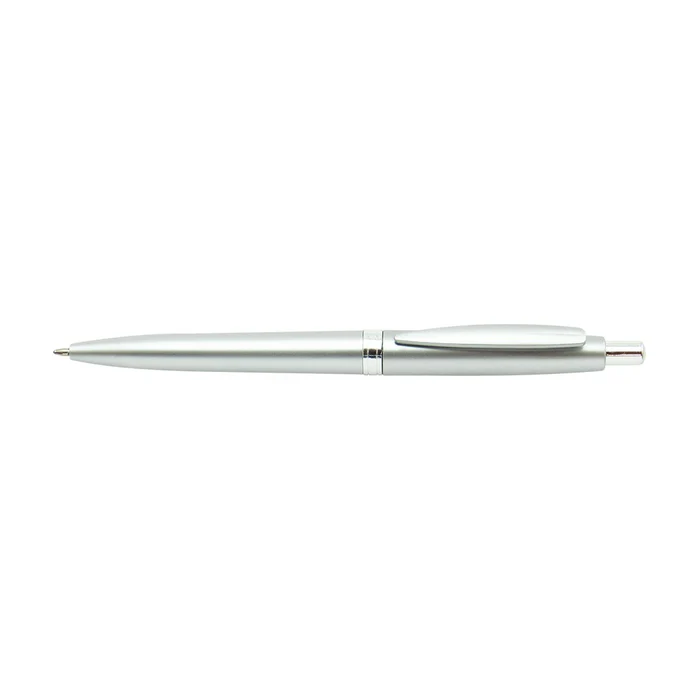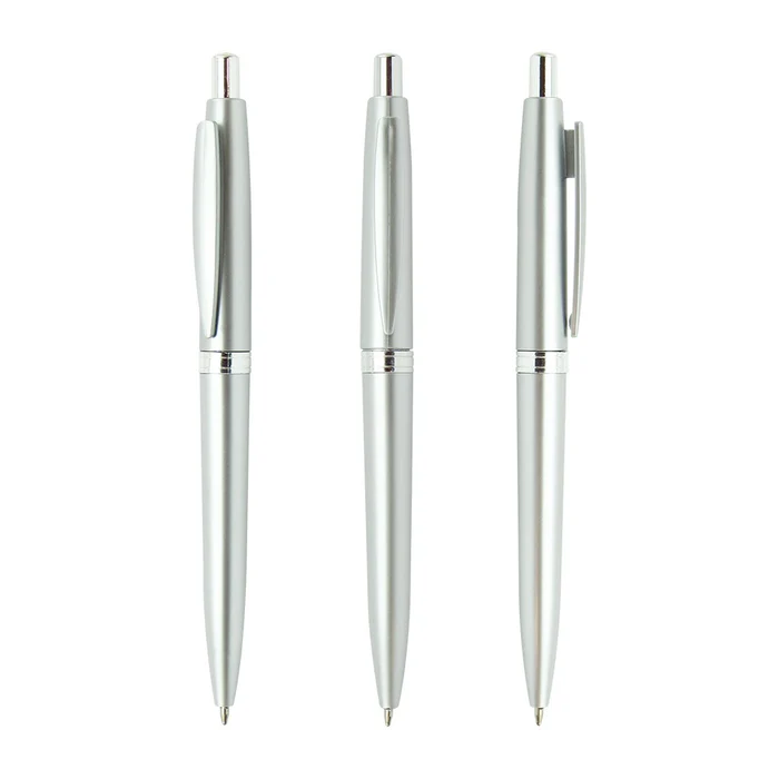 Esfero plástico color plata con sistema retráctil.