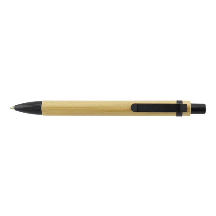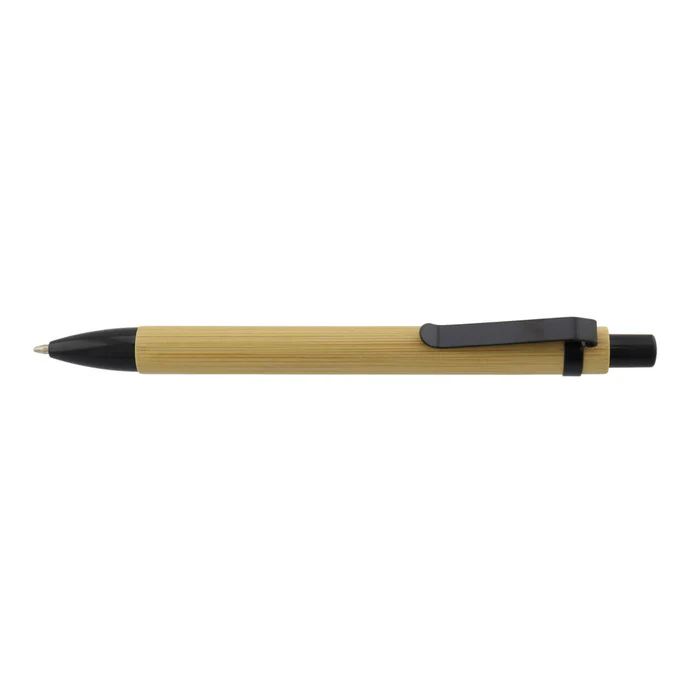 Bolígrafo de cuerpo tipo bambú con detalles en color negro. Su diseño ligero y moderno lo convierte en una excelente opción para campañas promocionales, kits corporativos y eventos. Ofrece escritura suave y cómoda, ideal para uso diario. Perfecto para personalización con logo.