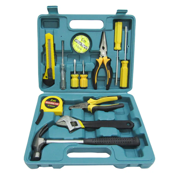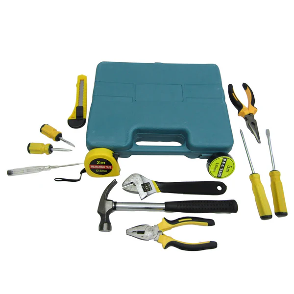 Juego de herramientas: bisturí, cuchillas, tester, destornilladores, metro, martillo, llave inglesa, alicate, pinza, cinta aislante.