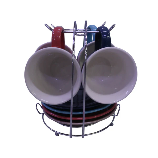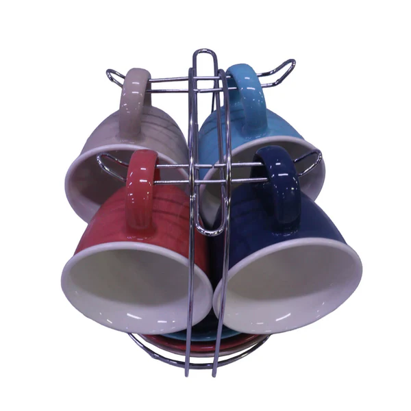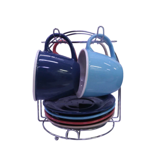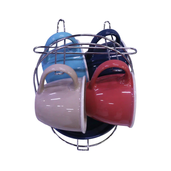 Juego chocolatero en cerámica con acabado brillante e incluye pocillos y platos en colores combinados. Viene organizado en una base metálica que facilita su almacenamiento y exhibición. Ideal para servir bebidas calientes con estilo en reuniones, desayunos o momentos especiales en casa.