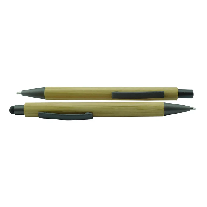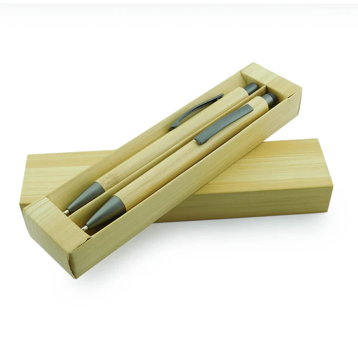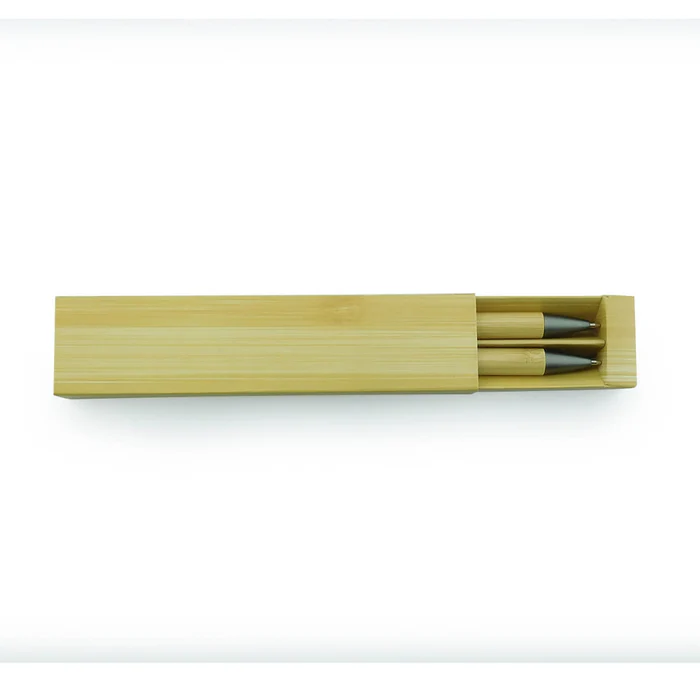 Kit de esfero y portaminas en bambú y estuche. Sistema retráctil y clip. Uno de ellos lleva goma táctil. Estuche en cartón, diseño bambú.