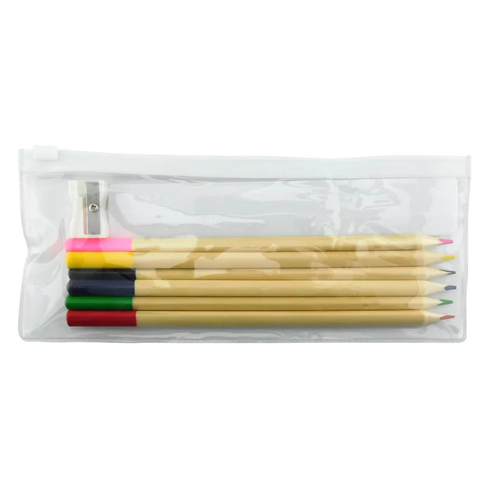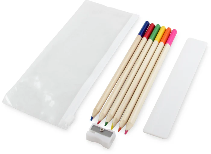 Kit en cartuchera elaborada en plástico, consta con 6 colores, Taja-lápiz y Regla.