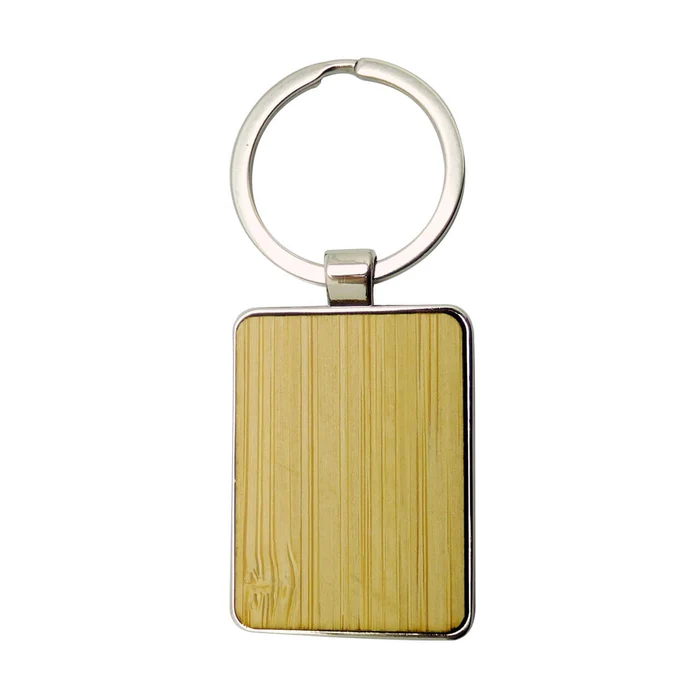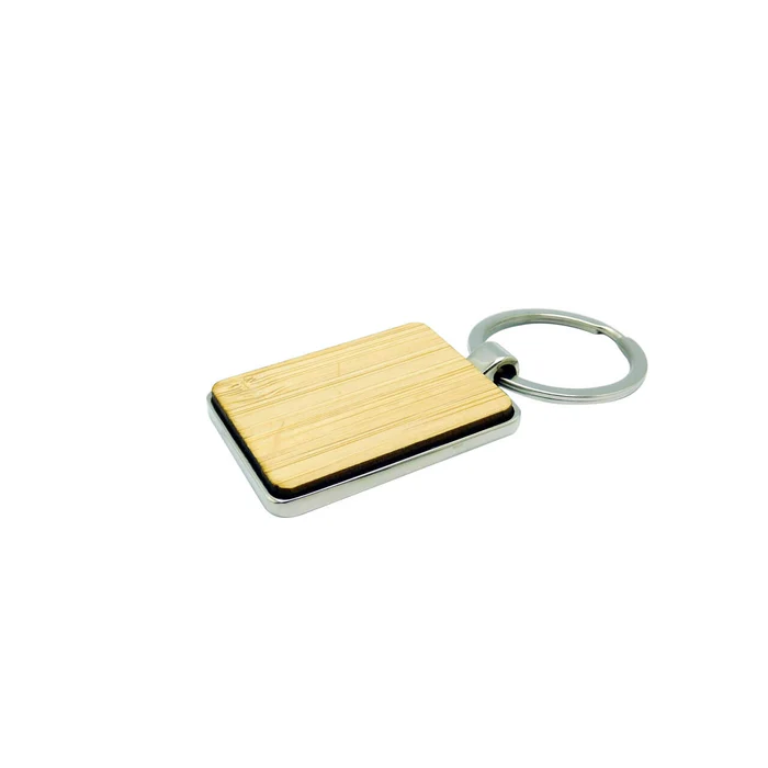 Llavero en bambú y metal presentado en bolsa individual.