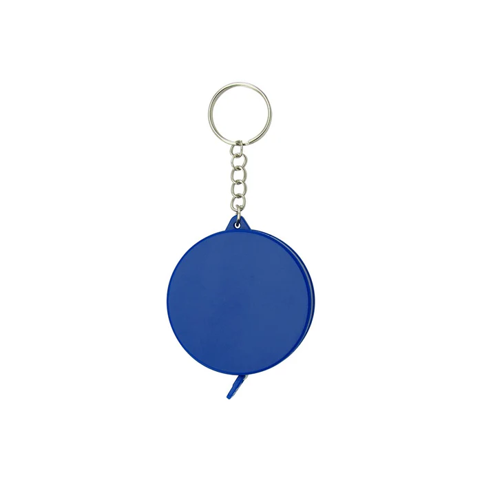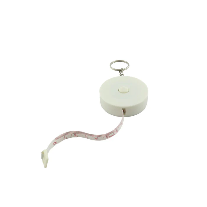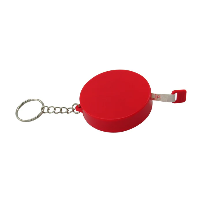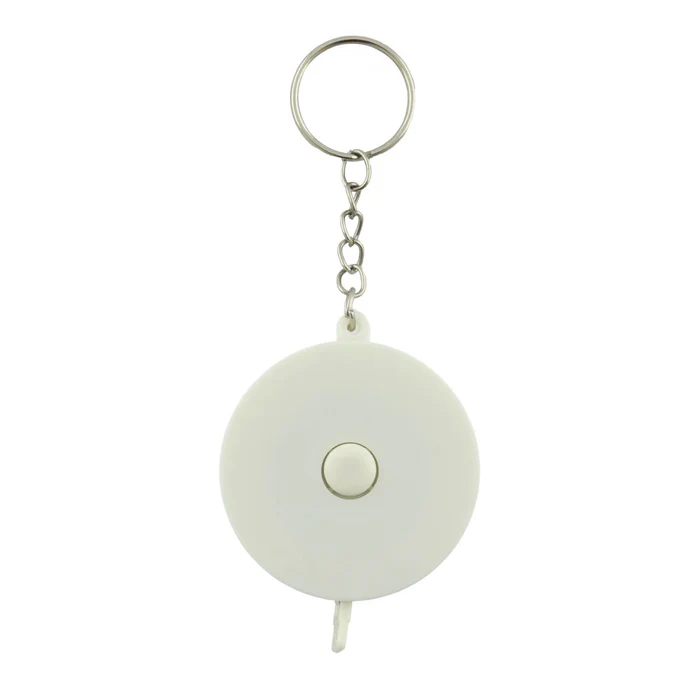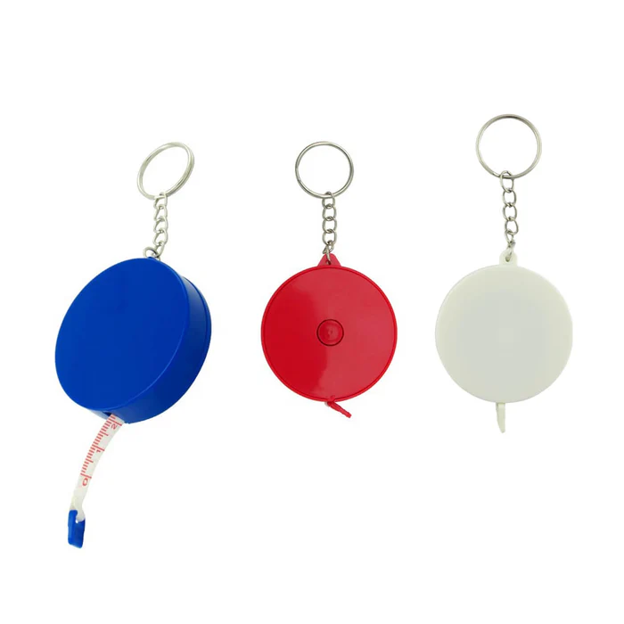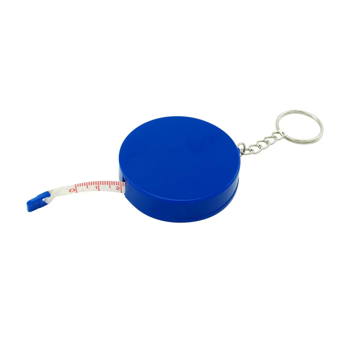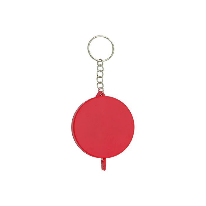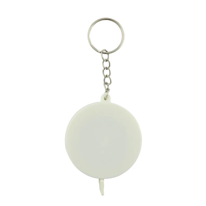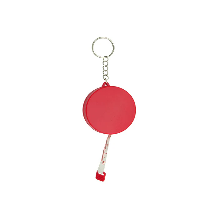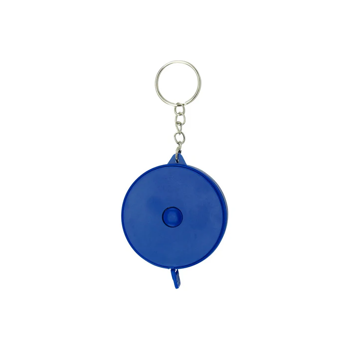Llavero metro elaborado en plástico, incluye botón retráctil para guardar la cinta métrica.