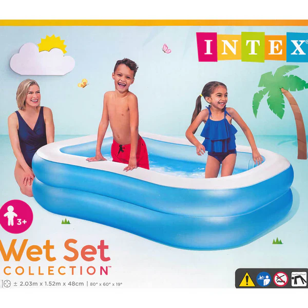 Piscina inflable familiar con diseño rectangular y paredes gruesas en color azul, ideal para disfrutar de actividades al aire libre en casa. Su estructura amplia ofrece comodidad para varias personas y permite divertirse y refrescarse durante los días calurosos. Perfecta para jardines, terrazas o espacios abiertos.