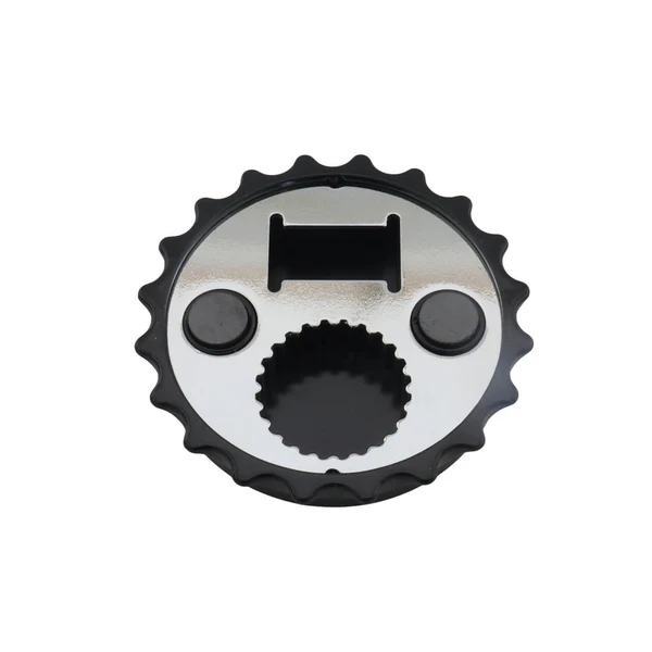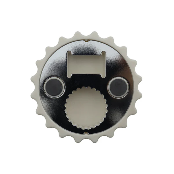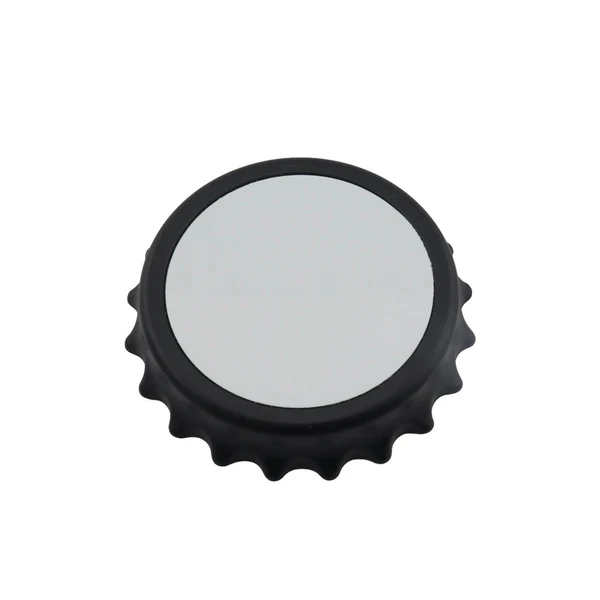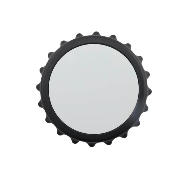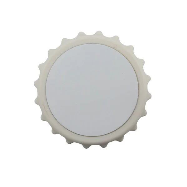 Destapador con forma de tapa metálica y superficie blanca lista para sublimación, ideal para personalizar con logos, diseños o mensajes. Su estructura magnética permite adherirlo a superficies metálicas, convirtiéndolo en un accesorio práctico para cocina, eventos o promociones.