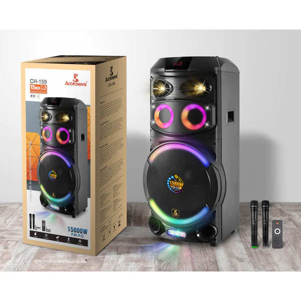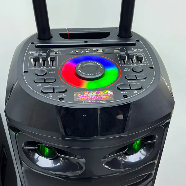 Torre de sonido con parlantes frontales de alto rendimiento y luces LED en tonos verdes y azules que crean un efecto visual dinámico. Incluye múltiples opciones de conexión y micrófonos integrados para karaoke, ideal para ambientar reuniones, eventos y celebraciones con buen sonido y diversión.