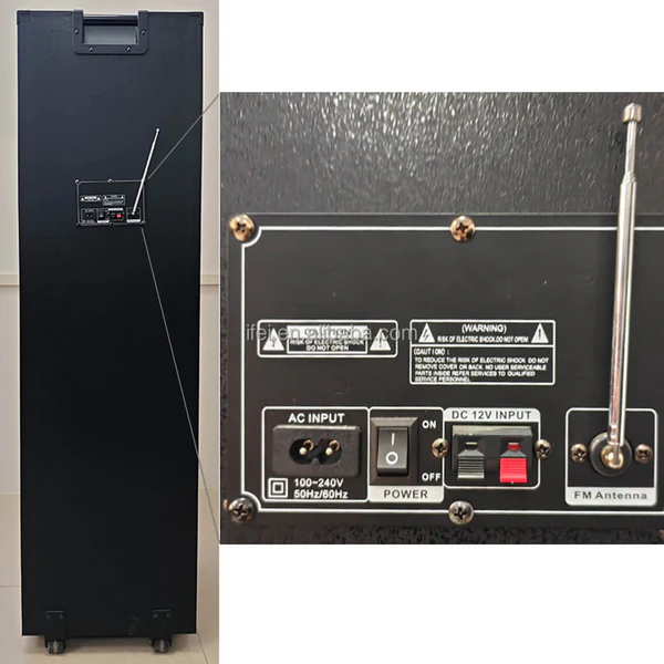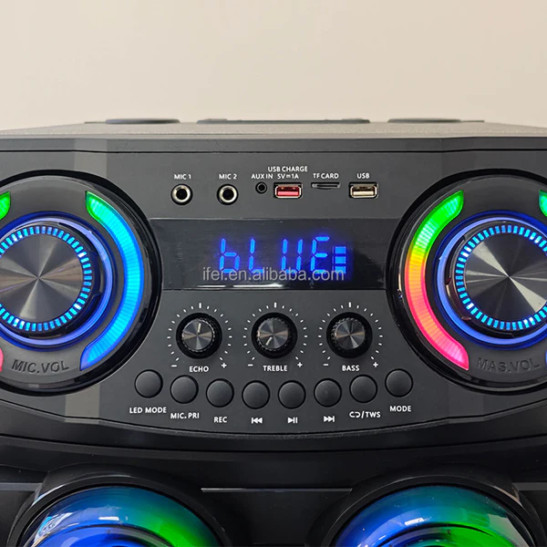 Torre de sonido de gran potencia con múltiples parlantes frontales y efectos LED en tonos vibrantes que crean un ambiente dinámico. Incorpora varias opciones de conexión y viene acompañada de micrófonos para karaoke, ideal para animar fiestas, reuniones y eventos con excelente sonido y entretenimiento.
